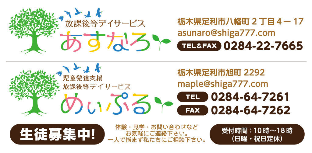 説明会(個別)では あすなろの特徴、料金、受給者証の取得方法などご案内致します。いつでもご連絡お待ちしております♪